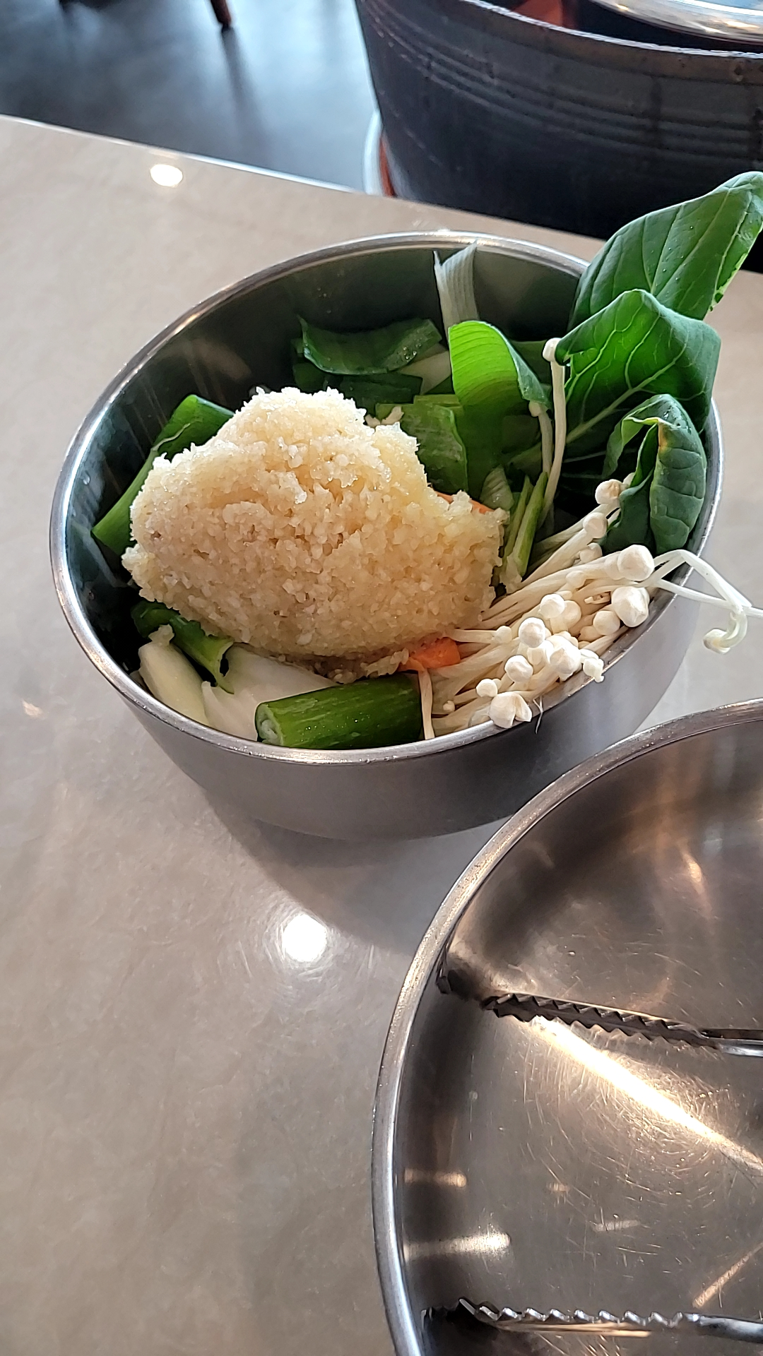 양푼에 팽이버섯, 대파, 청경채, 그리고 큼직하게 뭉친 다진 마늘이
