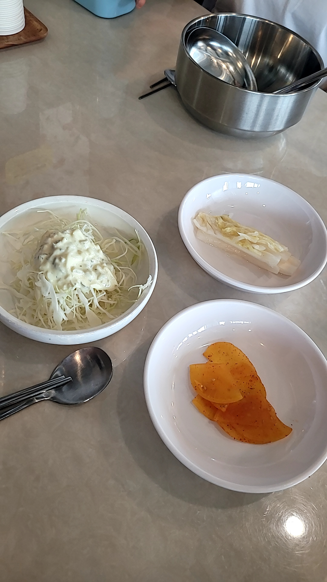 단무지, 백김치, 양배추 샐러드 세 가지가 전부예요.